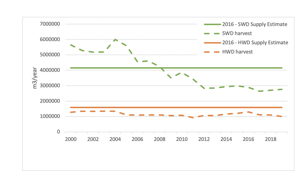 The excess harvesting has come from the softwood rather than the hardwood component: