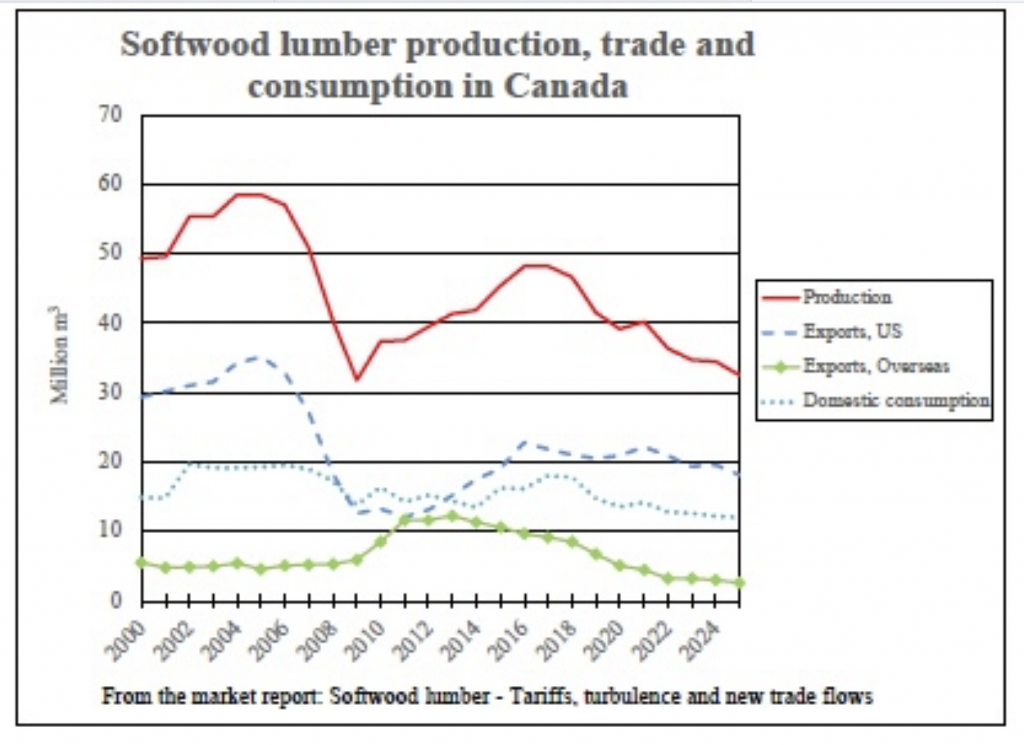 By: Håkan Ekström et al., on www.woodbusiness.ca, Nov 12, 2025 “Conclusions. Canada’s lumber and forest sector is expected to continue contracting through 2030. Sawmill capacity will decline, particularly among smaller and older operations in regions affected by insects and fires, and export patterns will slowly rebalance away from the US. Rural communities will bear the greatest impacts. If US tariffs are eventually removed, the surviving modern mills could benefit from improved margins as lumber prices are likely to increase in the US. Meanwhile, opportunities exist in gradually growing overseas markets and in the domestic construction sector, where housing starts would need to roughly double by 2035 to meet projected demand.Achieving that, however, would require policy changes, streamlined permitting, and lower construction costs – none of which are guaranteed.”