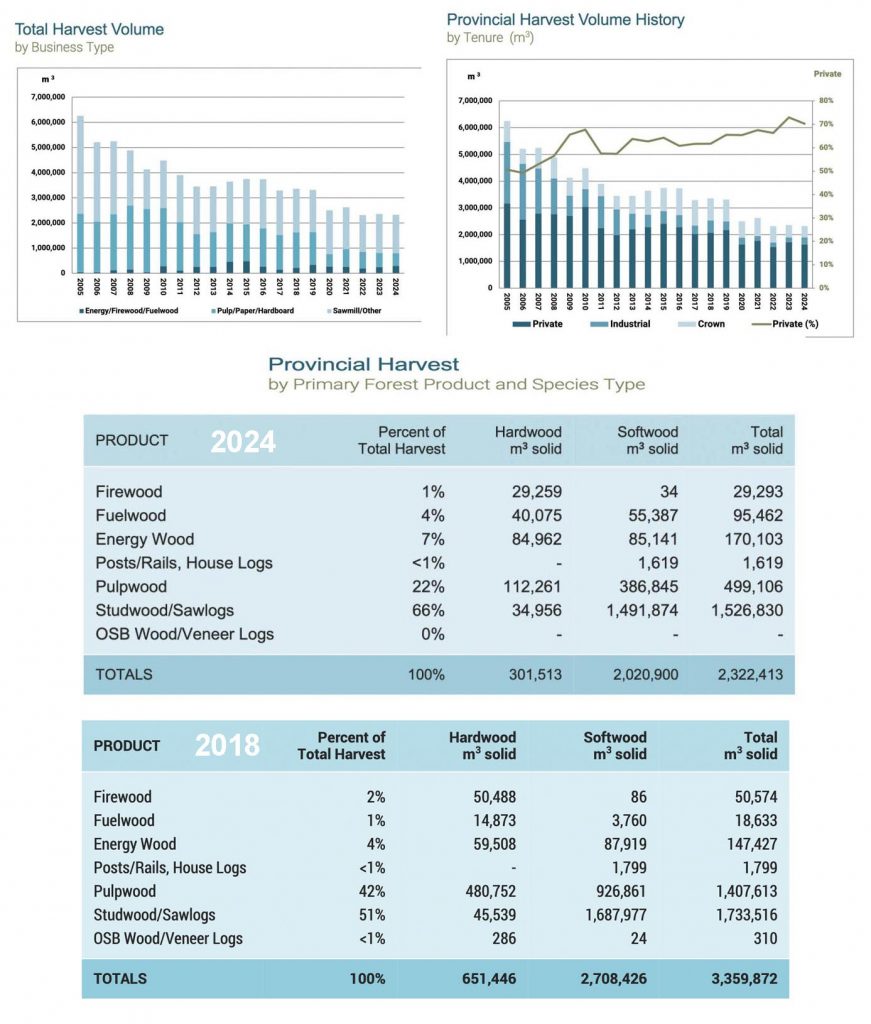 Charts in Fig 3. below show harvest volumes over time partitioned into Business Types, and Tenure; the Table shows Provincial Harvest in 2024 by Primary Forest Product & Species Type. Over time there has been a gradual increase in the percentage of volume from private lands (and a corresponding reduction in percentage from Crown lands, perhaps reflecting in part formal protection of some of the Crown lands). Major reductions in Pulp and Paper volume in 2012 and 2020 followed closure of pulp and paper mills (the top table shows data for 2018 before closure of Northern Pulp in 2020; and the lower table, data for 2024, well after closure).