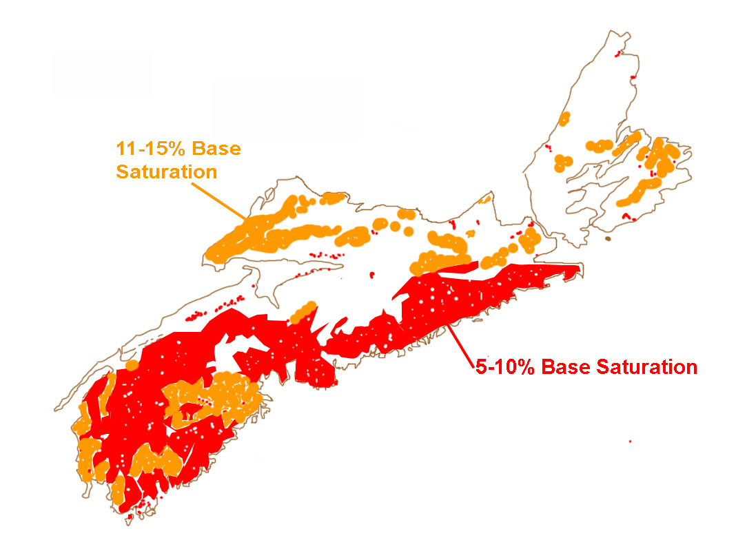 Chart 5: Sketch showing prominence of highly acidic, calcium-deficient/high aluminum forest soils in Nova Scotia. Sketch after Keys et al. (2016), Fig 3. View Soils /Calcium depletion /Acidification (on this website) for more about it.