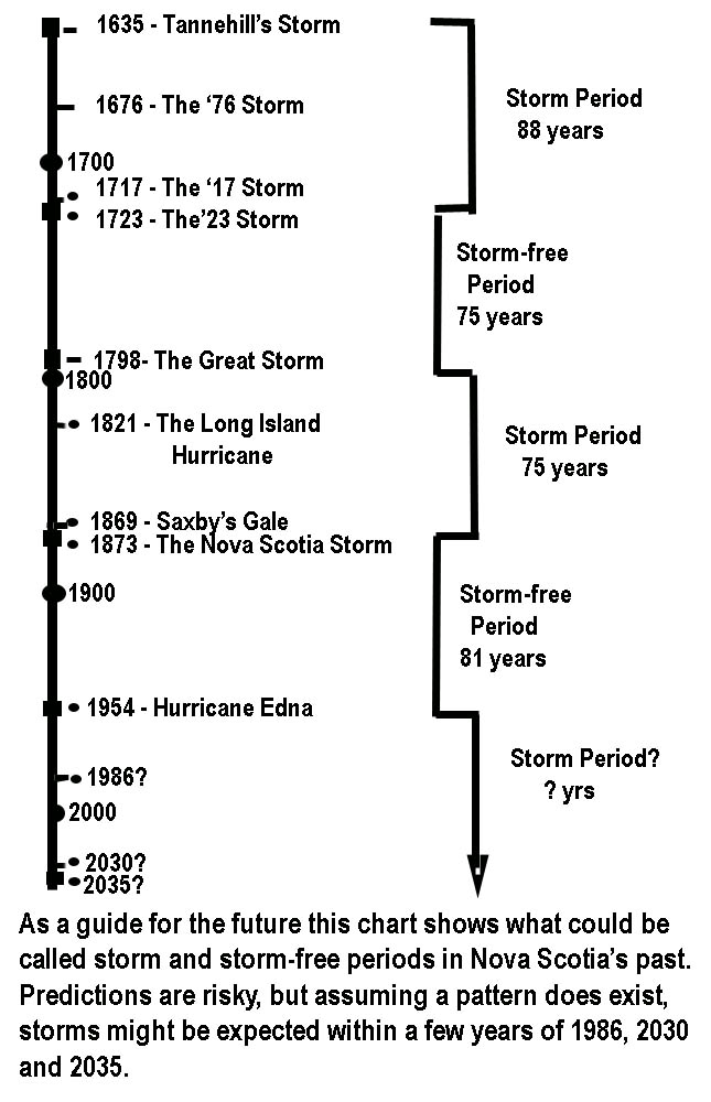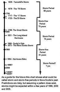 “Many of our forest stands in Nova Scotia are a result of past hurricanes. Mounds on the forest floor -the result of uprooted trees – indicate this.The age of trees growing on these mounds give a good indication of when the storm occurred. These stand ages compare well with the written records of past storms… A common age of forest stands in Nova Scotia is 100 years. The origin of many of these stands is the blowdown resulting from Saxby’s Gale.[1869] No doubt the Nova Scotia Storm of 1873 is a contributing factor too. George MacLaren writes in his Pictou Book that the storm of August 24, 1873 “… was probably one of the most severe and destructive that has visited our coast in years”. He calls it “The Big Blow.””