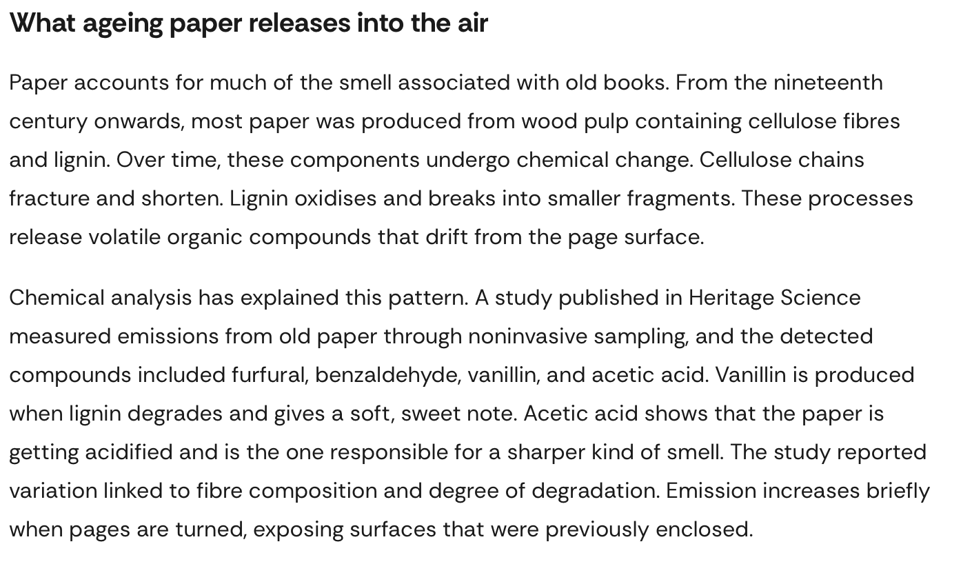 Times of India “The smell of an old book tends to surface before its title is ..Paper accounts for much of the smell associated with old books ..