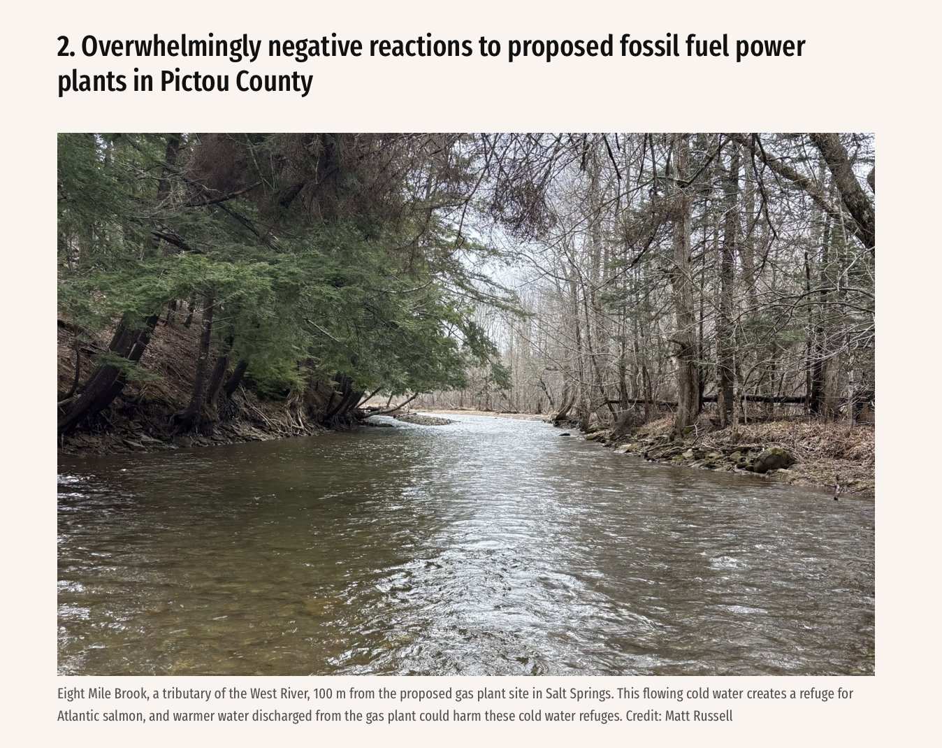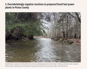 Joan Baxter in the Hfx Ecaminer, Intro in Morning File “Joan Baxter reports on a proposal by Nova Scotia’s Independent Energy System Operator (IESO) to build two 300-megawatt fossil fuel power generating plants in Pictou County. As Baxter found out, there’s overwhelming concerns from residents and environmental groups about what the plants will mean for the environment. IESO is a non-profit entity that was created by Premier Tim Houston under the April 2024 More Access to Energy Act. Baxter spoke to Matt Russell, a marine ecologist who grew up in Stellarton and is a member of the Pictou Rivers Association. Russell only learned early this year that one of the plants is to be built in Salt Springs, near critical salmon habitat in tributaries to the West River. The second plant is proposed for Marshdale, near the East River. ///Russell said both the West and East Rivers in Pictou County are crucial habitat for Atlantic salmon from the southern Gulf of St. Lawrence population. The salmon are federally listed as a species of special concern and under a lot of stress, Russell explained. He said there are 10 “scheduled” salmon rivers in Nova Scotia that are federally monitored. The West and East Rivers, where wastewater from the gas plants would end up, are two of them.“Why on earth would we risk damaging two of the 10 rivers that still have this species, when we have 297 rivers in this province?” Russell asked. Although he is concerned about the environmental impacts of both power plant projects, Russell is particularly worried about the one planned for Salt Springs, and how it could harm salmon in tributaries of the West River. “To me, it’s like building power plants in the middle of a national park,” he said. “I know it’s not a national park, but to me that section of the West River is just as valuable as any piece of land in this country.” Russell said many people he knows who share his concerns about the projects didn’t hear about them until after the Feb. 9, 2026 deadline for public comments had passed, and so were unable to make their voices heard. So far, the gas plants have not received a great deal of public scrutiny or attention.///Baxter gets into the details of the proposals, how little notice the public had to offer feedback, and much more.”