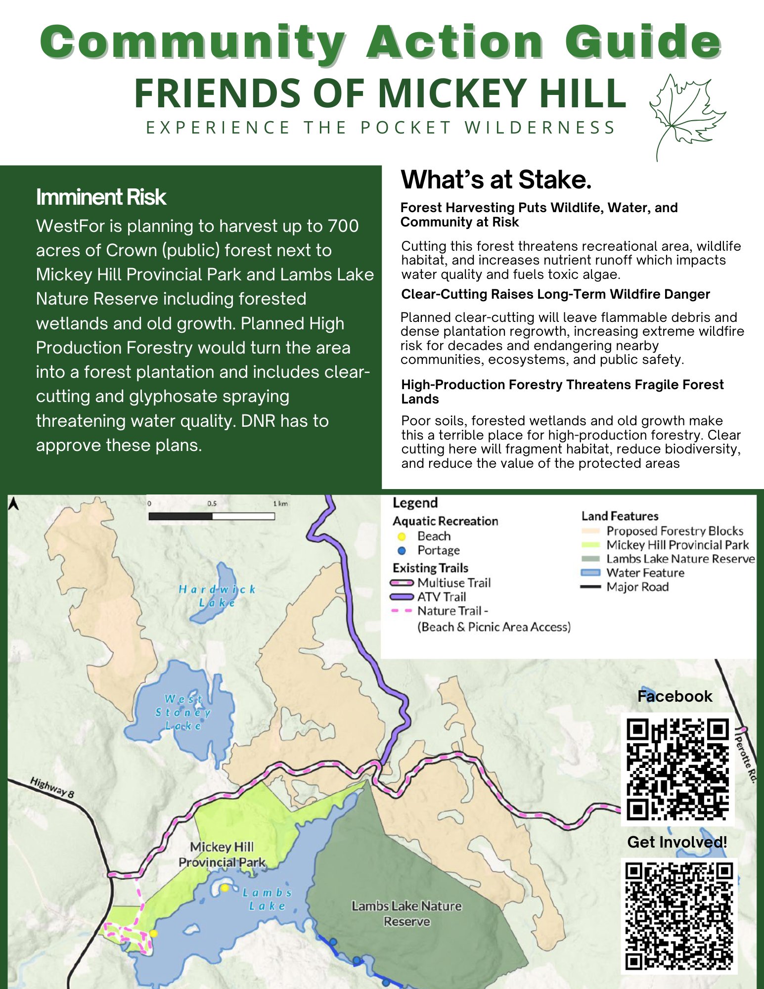 Clear-cutting near small protected areas such as Mickey Hill Provincial Park and the Lambs Lake Nature Preserve would fragment already limited intact forest, undermining ecological resilience in a heavily industrialized forestry landscape.