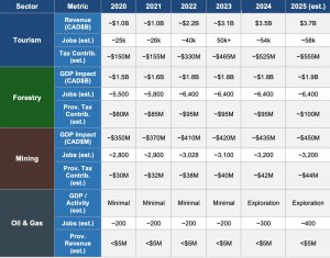 This table compares all four sectors across revenue/GDP impact, employment, and provincial tax contribution over the study period. Note that ‘Revenue’ for tourism represents total tourism spending (a broader measure than GDP), while Forestry, Mining, and Oil & Gas figures represent GDP impact or value-add.