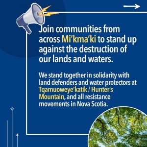 We stand together in solidarity with land defenders and water protectors at Tqamuoweye’katik — Hunter’s Mountain — and all resistance movements in Nova Scotia.Tell Tim Houston to stop selling our futures. Demand that he respect the Treaties, our democratic rights, and our community voices!