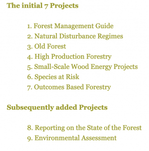 In regard to item (d), the independence from DNR and the reduced pressure for intense scrutiny by DNR (item g) – and also reduced pressure on DNR staff – would be provided by implementation of Outcomes-Based Forestry Management, another of the suite of 9 projects set up to implement the Lahey Recommendations (see list at right).