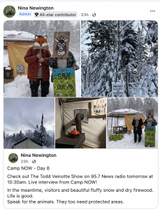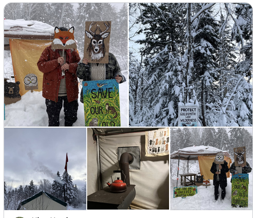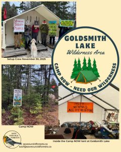 Listen to interview with Nina Newington on Todd Veinot Show, Dec 9, 2025. Todd V asks: Explain the theory behind this camp? Why are Old Growth forests important? Whats the difference between an Old Growth forest and an old forest? Regarding carbon capture, whats the difference between a 30 year old forest and an old forest? Can there be a balance between those that want to log and those that want to protect? The government changed laws on these kind of protests this year – any concern that they might come and shut you down? What would get you out of out of the tent tomorrow? On the last question Nina replies “Well if the government said yes we’re gonna get Environment to do the formal review of Goldsmith Lake Wilderness area so that we’re working towards protecting it and in the meantime will put a freeze on the harvests we have planned for this area that would do it…” |