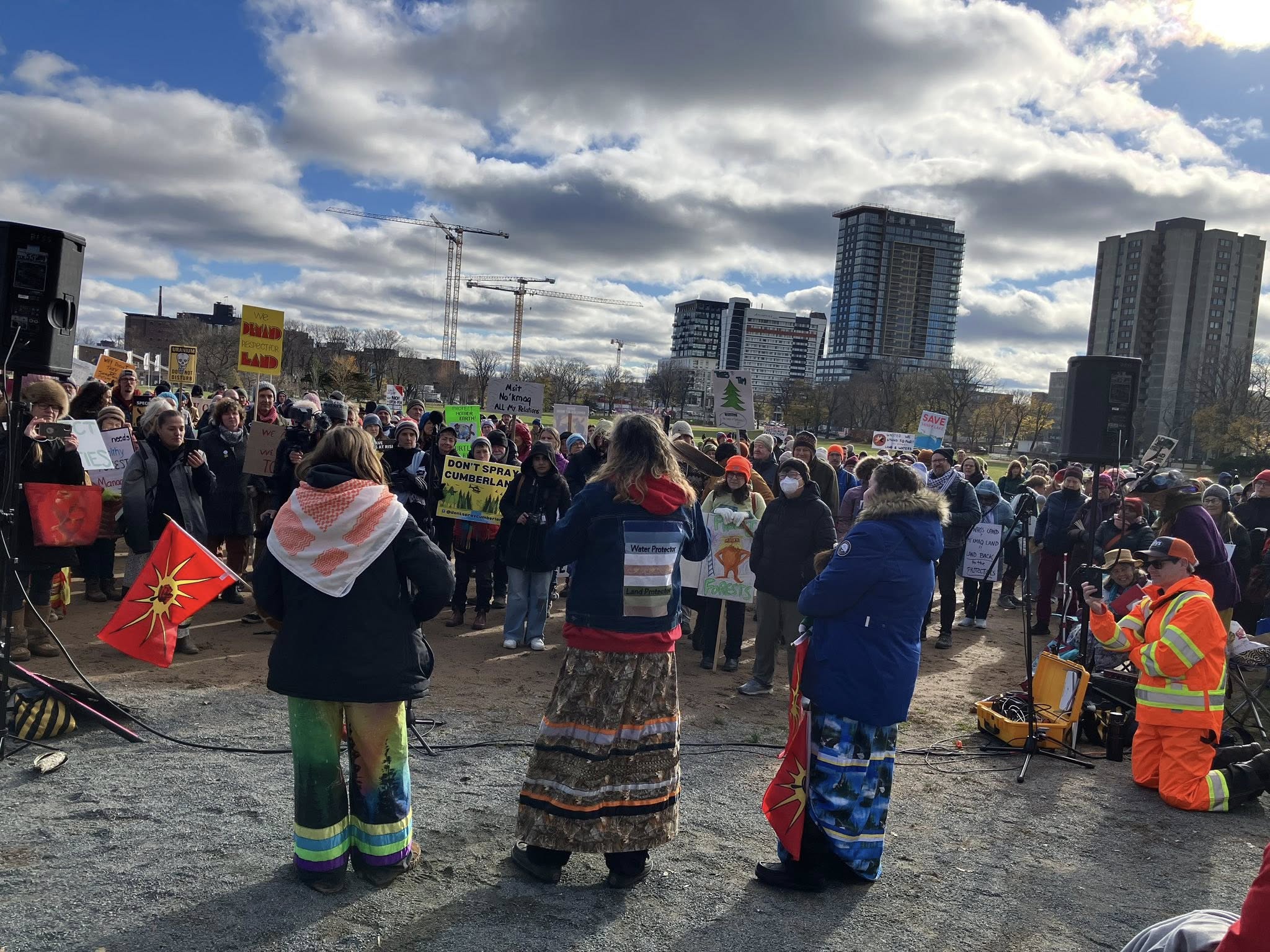 Nov 15: Received from Nina Newington while participating in the rally with a group from the Annapolis Valley/SOOF: “A few photos from today, 450-500 people, good speakers, drummers, spirits…”